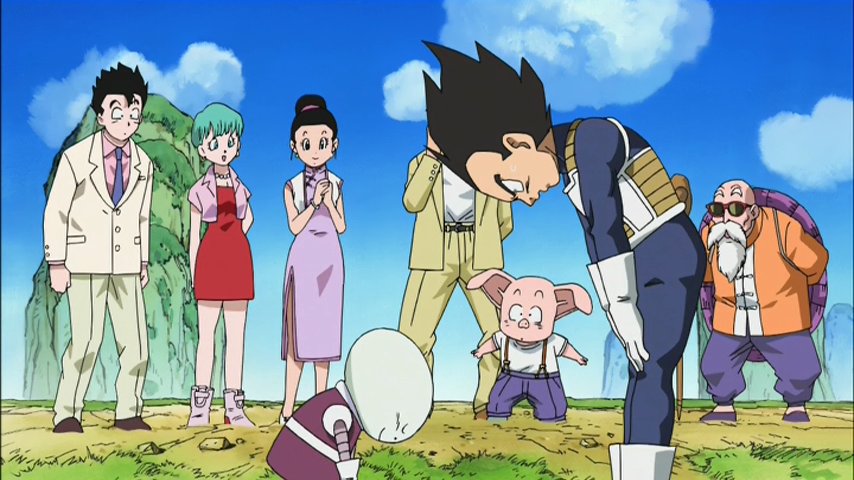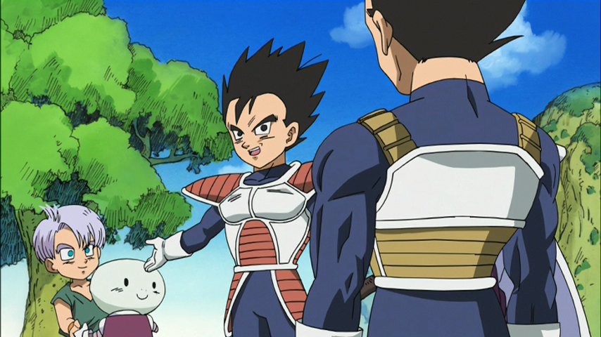 Après ce petit tournoi paysan, Trunks obtient le droit de se battre contre les gars, ce qui tombe bien parce que comme Gokû triche un peu (encore !) et fait participer Goten vu qu'il y a deux ennemis. Et l'argument qui tue pour calmer Végéta, c'est qu'avec une puissance équivalente à celle de Freezer (à quel moment ?!) le combat sera équilibré comme ça. Les ennemis sont là, les adversaires ont été désignés, la fête peut commencer.